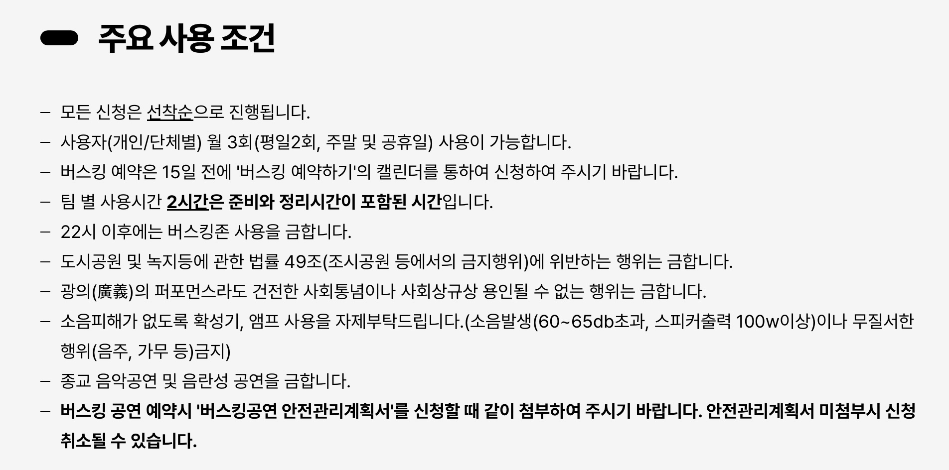 - 1인/1팀 월 최대 3회까지 공연 가능 (평일 2회 + 주말 1회)