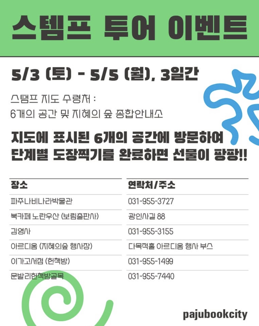 파주출판도시 곳곳에 숨겨진 10개의 스탬프 스테이션을 찾아 모험을 떠나보세요! 스탬프를 모두 모으면 특별한 기념품과 함께 추첨을 통해 다양한 상품도 받을 수 있습니다.